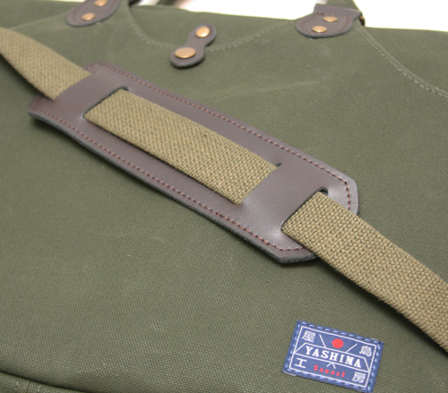 緑色をした生地は、屋島工房おなじみのパラフィン(蝋による撥水)加工をした帆布生地。素材は綿でありながらも、自衛隊御用達のお墨付きをもらった強靭な材料です。綿ならではの肌触りと、使い込むほど魅力が増すエイジングが楽しい素材でもあります。